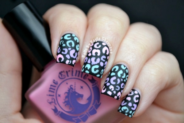 I started off with a base of China Glaze Liquid Leather on all of my nails. The original design used acrylic paint for the leopard spots and since I don't own any myself, I had to search through my stash for some opaque polishes that would pop over the black base. Luckily, the Lime Crime Les Desserts d'Antoinette Collection features colours very similar to the original design colours AND they work great over black! The blue is Once in a Blue Mousse, the purple is Lavendairy and the pink is Parfait Day.