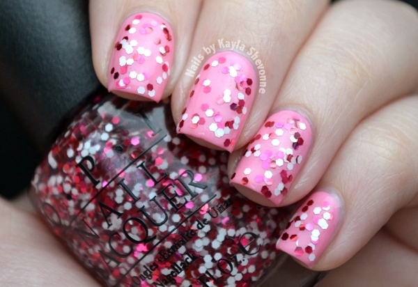 Minnie Style consists of red, pink and white hex glitters in a clear base. Style-wise, it reminds me a lot of OPI The Living Daylights from last year's Skyfall Collection. I've shown it below layered over Chic From Ears to Tail. The glitter payoff was really good - I only needed one coat to get the coverage you see. The formula was also good, but I did find that the glitters wanted to stick together, so I did a little pushing with the brush to get them to sit where I wanted them to.