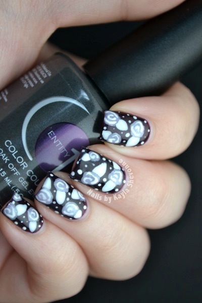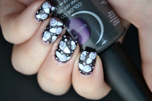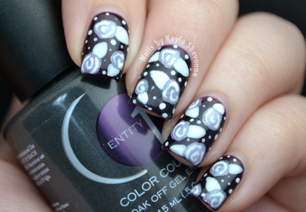 After the necessary prep stages for gel nails, I applied two coats of Entity 1 Midnight Runway, a deep purple shade, to all of my nails. After that had cured in my UV light, I used a very small amount of Zoya Julie and a medium sized nail art brush to create the basic rose shapes. Then, using Entity 1 Spotlight, an opaque white, I used a smaller nail art brush to create the leaves, the finer details on the roses, as well as some dots. I cured that, added the Color Couture top coat, cured that as well, and then voila!
