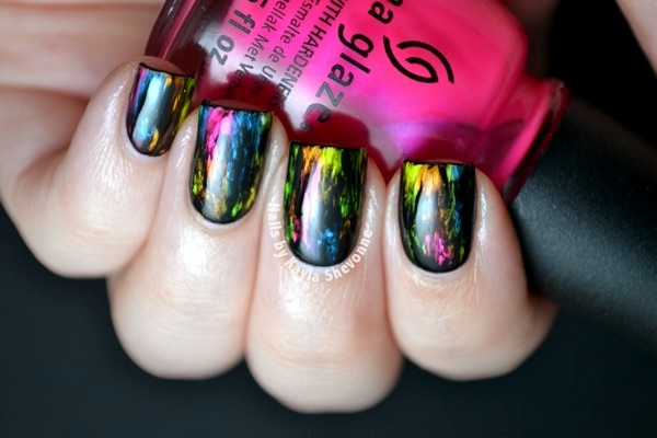 After about an hour (or however long it took to play two matches of Call of Duty: Black Ops II Zombies), I went back and painted a coat of China Glaze Liquid Leather over all of my nails. I waited for that to dry slightly and then took a fan brush, dipped it in some pure acetone, and swiped it several times over each nail. The acetone removed some of the black polish, allowing the bright neons to show through! And because I added that layer of top coat earlier, the acetone didn't penetrate deep enough to ruin any of neon colours.