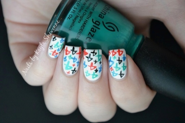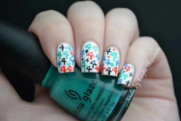For this design, I started with a base of Wet 'n' Wild French White. I then used a small detail brush and drew on the number 4 in various sizes. The polishes I used are OPI Ogre-the-Top Blue, Wet 'n' Wild Black Creme, OPI Red Lights Ahead...Where? and China Glaze Four Leaf Clover.