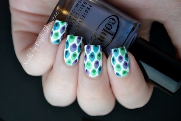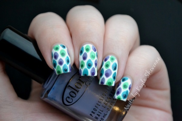 The base colour of this design is Wet 'n' Wild French White. The purple feathers were done using Color Club Pucci-licious and Orly Charged Up. The blue feathers were done using OPI Fly and OPI Ski Teal We Drop. Finally, the green feathers were done with Illamasqua Nomad and Orly Lucky Duck.