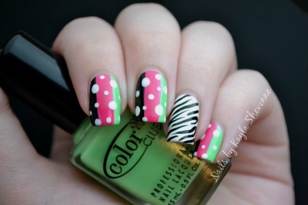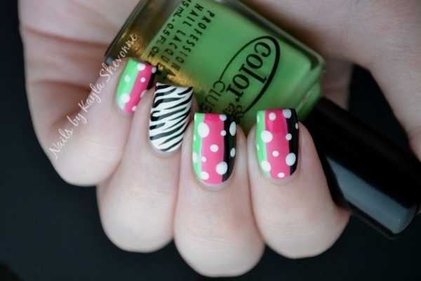 To create this design, I started with a base of white on all of my nails. I then used a striping brush to block off the pink, green and black sections. The black is Wet 'n' Wild Black Creme, the pink is OPI Kiss Me On My Tulips and the green is Color Club Twiggie. I added the dots using a dual-ended dotting tool and the zebra stripes were done using a striper brush.