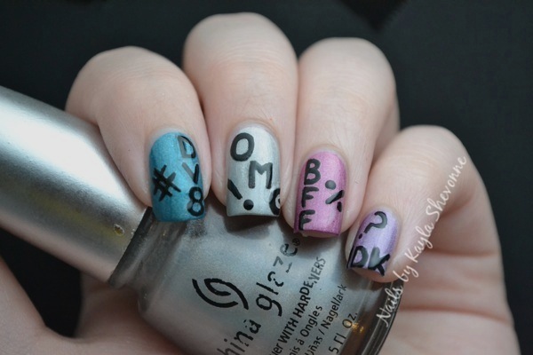 To add a little more to the "text talk" theme of this, I also did some special characters including a hashtag, an explanation point, a percentage sign and a question mark. All of the lettering was done using a small detail brush and Wet 'n' Wild Black Creme.