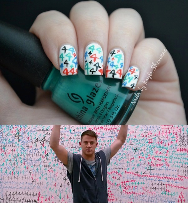 Through the antics, both lead characters take the drug in order to not blow their cover. While high, Tatum's character goes on a scientific rant while writing on the white board in science class. When he steps back, the board is covered with just the number 4. It's probably one of the funniest scenes in the entire film and I just had to emulate it for today's mani!