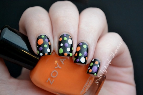 The base for this design is my go-to black creme - Wet 'n' Wild Black Creme. For the dots, I started by creating them all in white with a couple of different sized dotting tools. I did this because I wanted to ensure that the purple, orange and green stood out against the black. Speaking of the purple, orange and green, they are China Glaze Spontaneous, Zoya Arizona and Orly Green Apple, respectively.