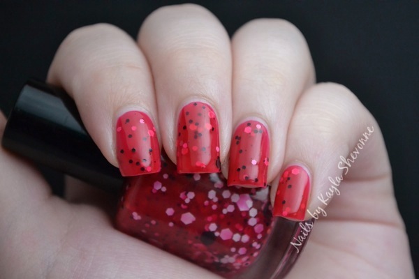 Pretty & Polished Swing is a semi-sheer red jelly polish with black, silver and white hex glitters throughout. This is one of those jelly-sandwich-in-and-of-itself kind of polishes. The formula was easy to work with, although I didn't get any of the larger pieces of glitter; a little fishing with the brush would have done the trick. My swatch shows three coats of Swing on its own.