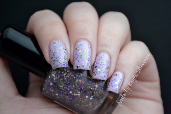 Candeo Colors Mallard is a sheer lilac base loaded with purple shimmer as well as silver, lime and green hex glitter pieces. I've shown it here layered over China Glaze Sweet Hook from the Electropop Collection. The formula was really great and it flowed nicely onto the nails. I love the combination of purple and green, especially in this sort of delicate combination.