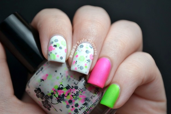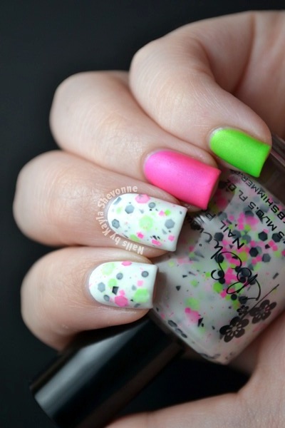 What's Your Damage? features a milky white jelly base with lots of black, hot pink and neon green glitter. The glitter comes in varying shapes and sizes; there's hexes, squares, circles and small shards. To create a fun and coordinating mani, I decided to paint What's Your Damage? on only my index and middle nails while I used China Glaze Hang-ten Toes on my ring nail and China Glaze I'm with the Lifeguard on my thumb and pinky nails.