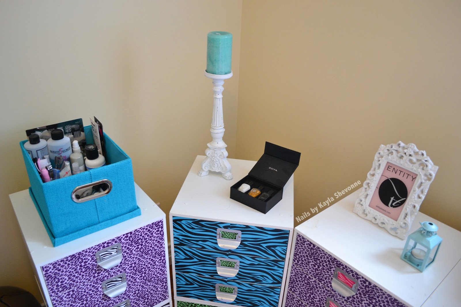 On top of my Melmers, you'll see some more decorative items such as a big candle stand, a cute little lantern candle, my little "create" sign that I painted (with nail polish, of course) to match my Melmers, and the same framed nail-related photos that were originally on top of the desk in the first post. There's also the Zoya Gilty Pleasures box set which I thought was too pretty to be hidden in a drawer.