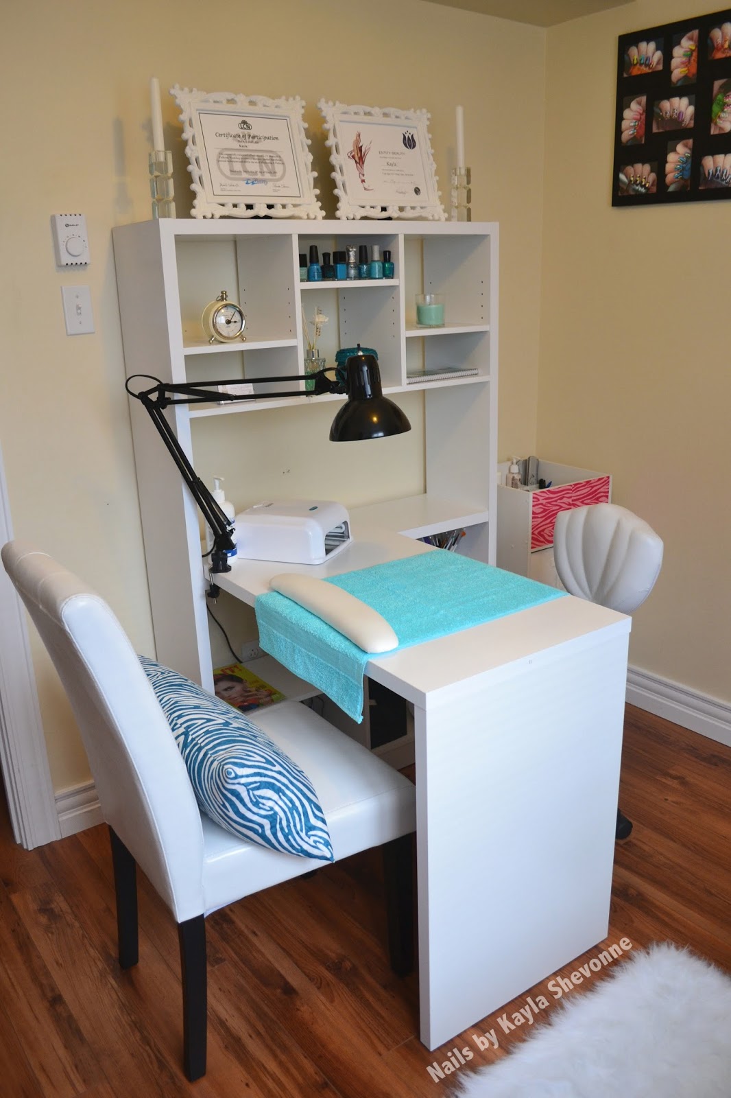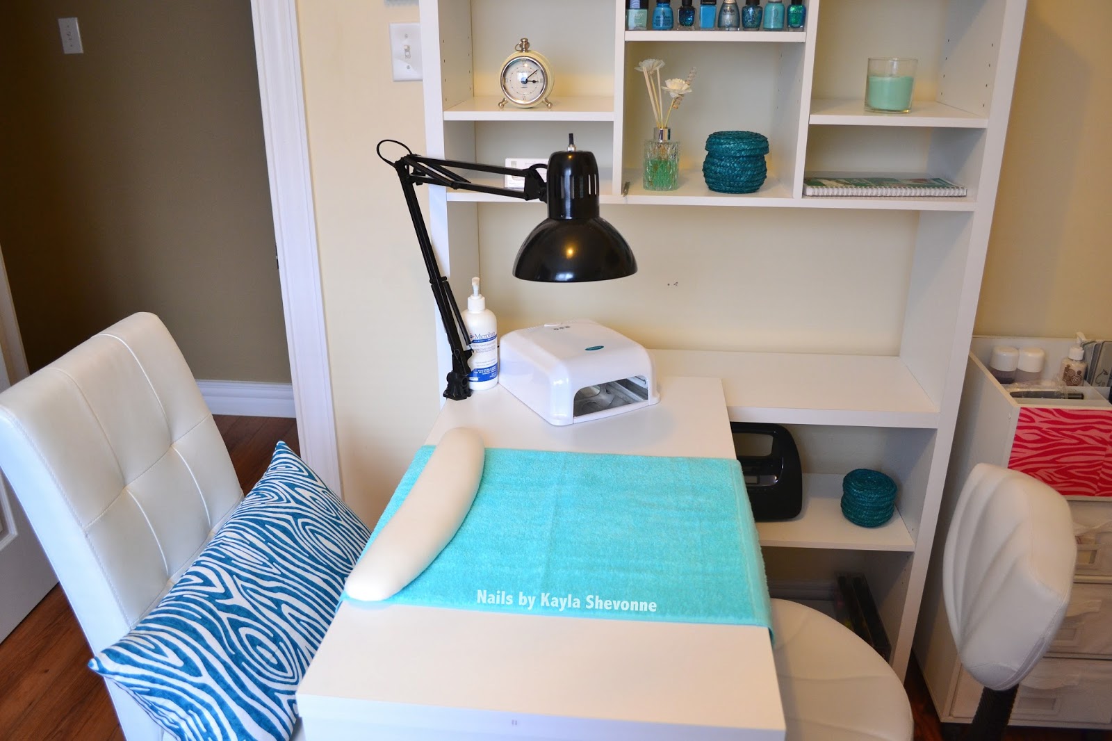 Moving on. The chair on the left is for clients and the chair on the right is my new nail tech chair! I didn't have that one in my last post because it was actually a gift from my lovely future mother-in-law after I completed my training! The client chair is the same faux leather chair from Bouclair Home that you saw before and my new nail tech chair is from a local professional supply store. The awesome zebra print pillow that's sitting on the client chair is from Winners. I love the pillow because it not only ties in with the white and blue theme, but also with the animal print on my Melmers!