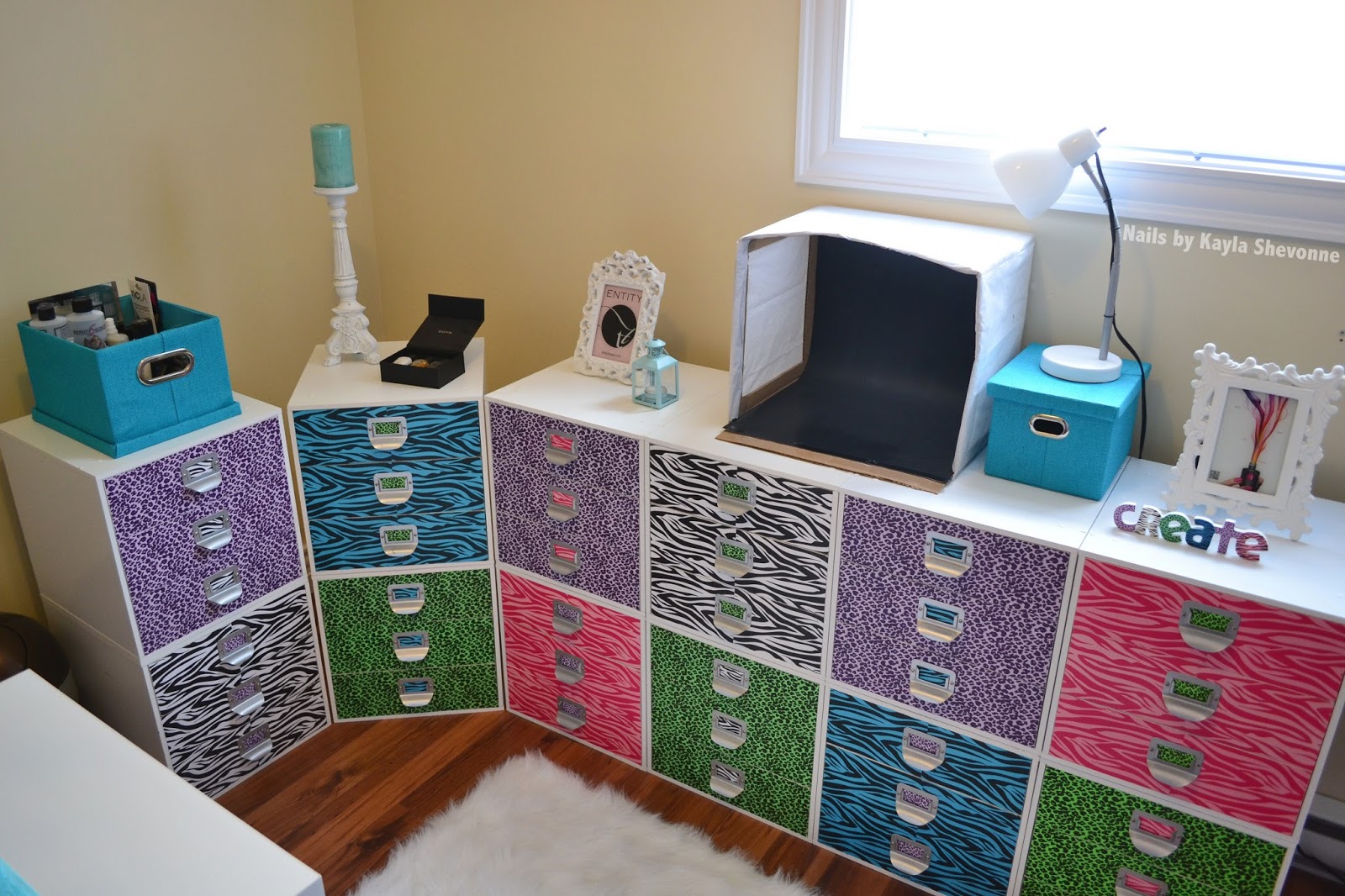 Moving along you'll see all of my Melmers. For anyone who's not sure what a Melmer is, it's a name coined by the nail polish community for storage cubes from Michael's Craft Stores. It's a play on the word Helmer, which is a popular nail polish storage solution from IKEA. They're plain white when you purchase them, but I decorated them using animal print scrapbook paper.
