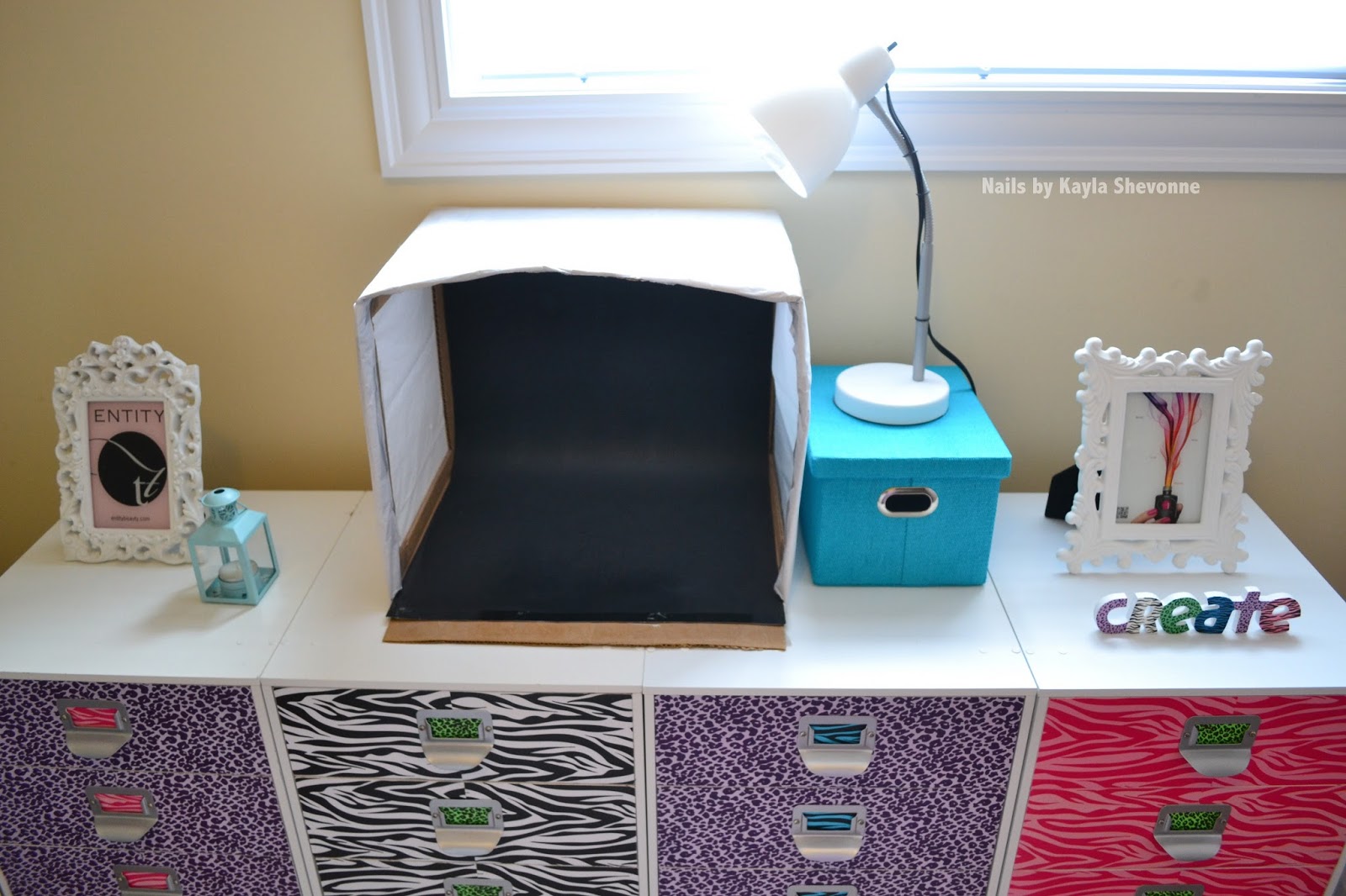 The two blue bins are new and they're both from Bouclair Home. The larger one contains polish supplies such as remover, base and top coats, lotions, etc, and the smaller one houses my camera and its supplies. Finally, there's my homemade lightbox.
