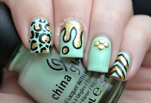 As I said above, the lovely mint creme base colour is China Glaze Re-fresh Mint. The other polishes I used include Zoya Ziv (the gold shimmery shade) and China Glaze Liquid Leather (the black creme).