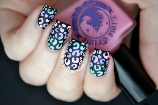 I started off with a base of China Glaze Liquid Leather on all of my nails. The original design used acrylic paint for the leopard spots and since I don't own any myself, I had to search through my stash for some opaque polishes that would pop over the black base. Luckily, the Lime Crime Les Desserts d'Antoinette Collection features colours very similar to the original design colours AND they work great over black! The blue is Once in a Blue Mousse, the purple is Lavendairy and the pink is Parfait Day.