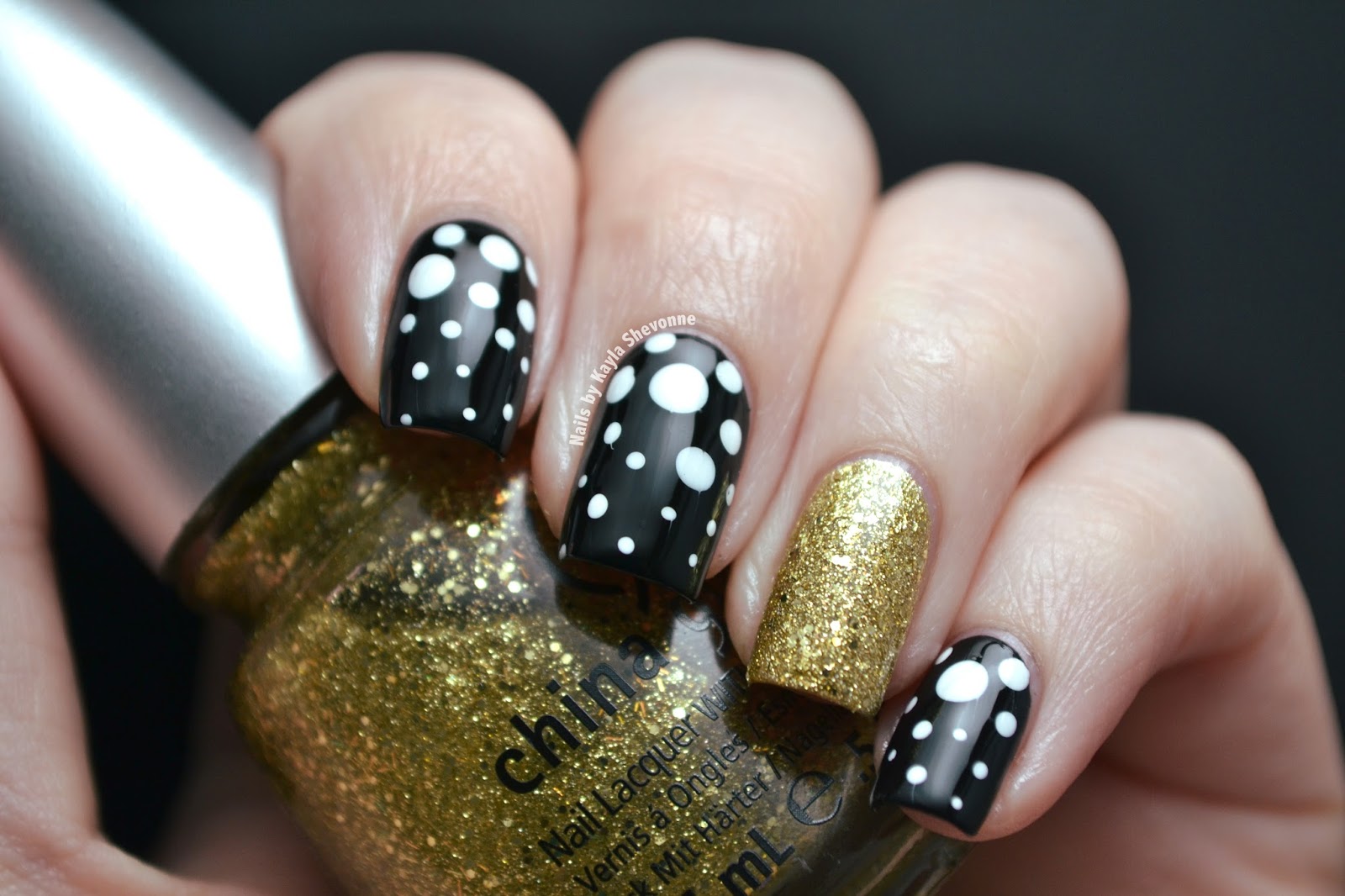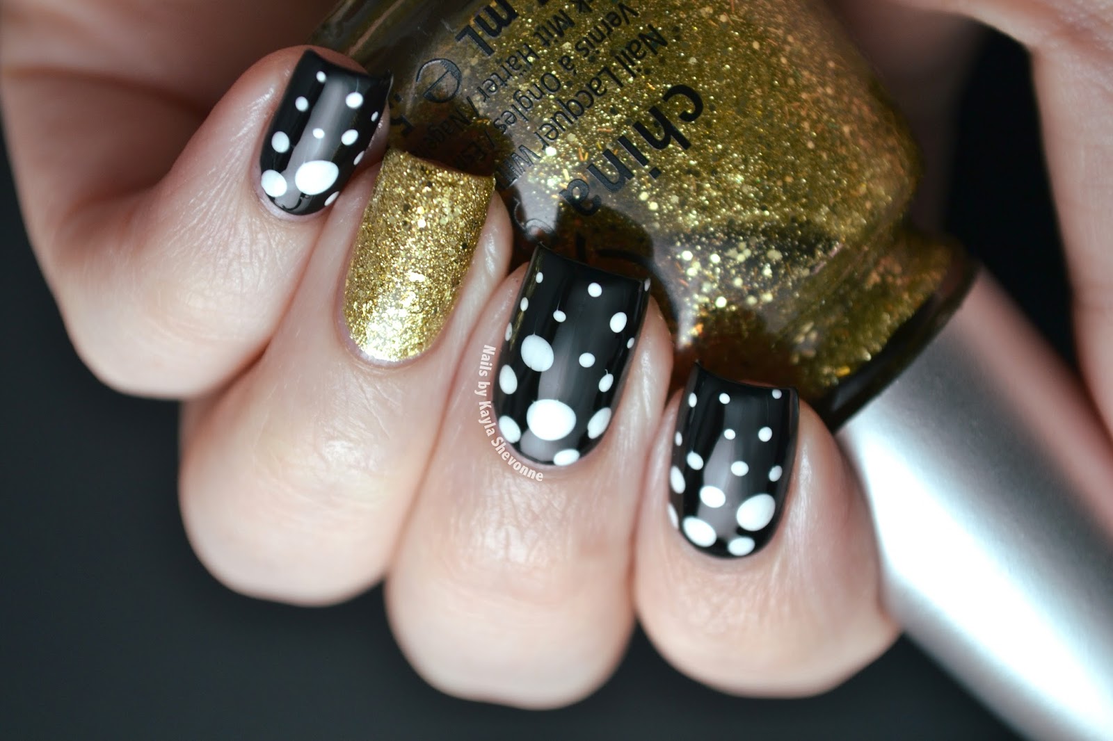 The base for the polka dot nails is China Glaze Liquid Leather and I followed that up with some simple polka dots using a couple of different sized dotting tools and China Glaze White on White. The blingy accent nail is a base of China Glaze Midnight Kiss followed by two coats of China Glaze Blonde Bombshell. I topped everything with a coat of Seche Vite and voila!