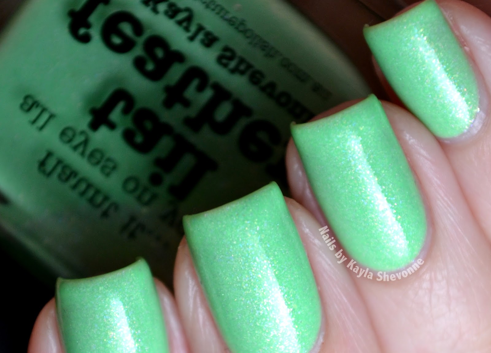 Leccy is a flakie topper that consists of opalescent flakes that shift from blue to purple to even gold. The flakes are slightly sparse so I recommend applying one coat as normal but then using the brush to just dab on a few extra flakes in any bare areas. Apparently "Leccy" is brit slang for electricity, which I think is a pretty neat fact.